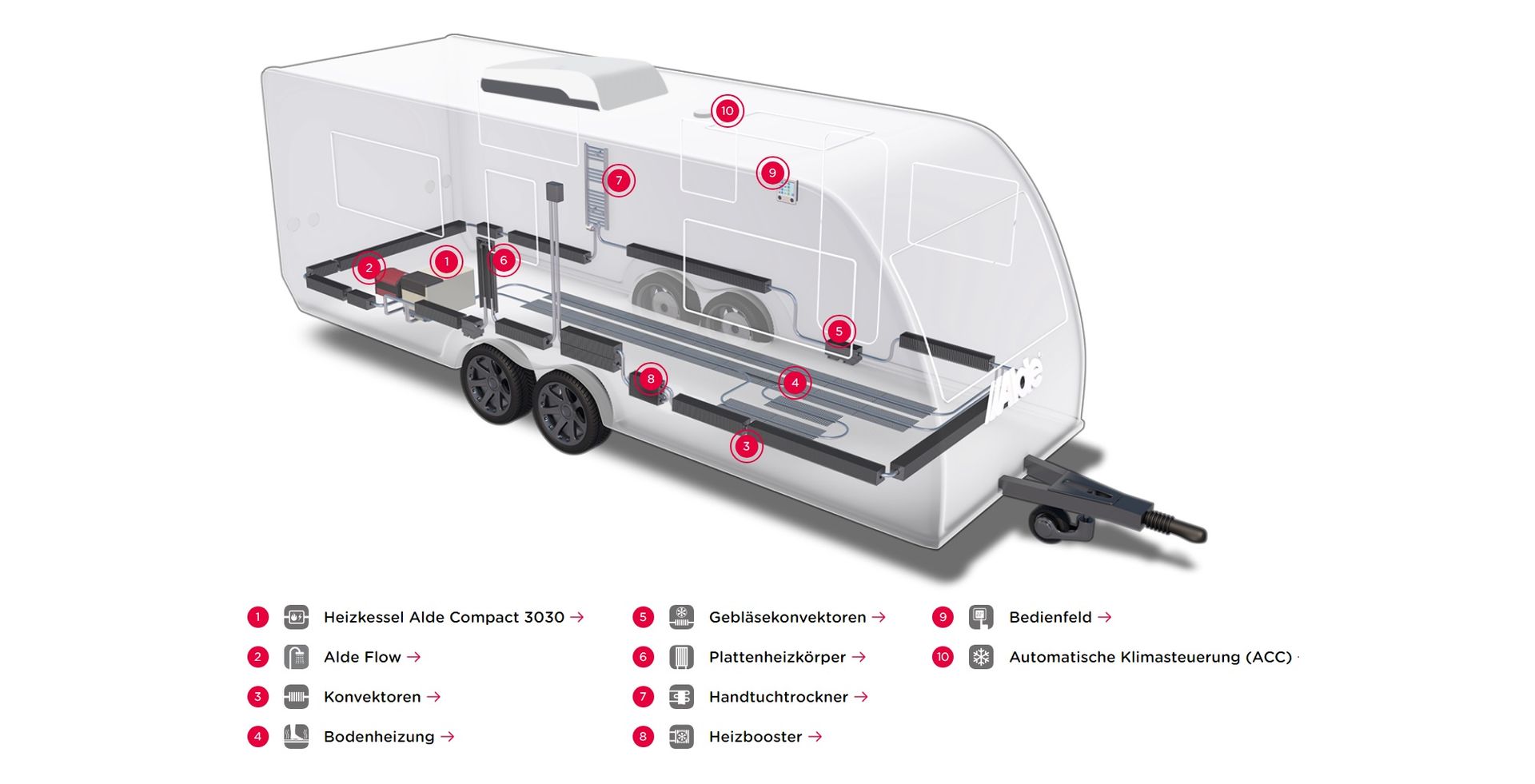 Heizungsanlagen sind bis ins kleinste Detail durchdacht. Die Alde Handtuchtrockner halten für die ganze Familie nach der belebenden Dusche warme Handtücher bereit. Mit Alde Gebläsekonvektoren in den Garderoben trocknen feuchte Sachen und Schuhe. Und für noch mehr Komfort im Fahrerbereich des Wohnmobils sorgen spezielle Konvektoren, Heizbooster und eine Heizmatte, die mittels Schnellkupplung an das Heizsystem angeschlossen werden kann. Das sind nur einige Beispiele.